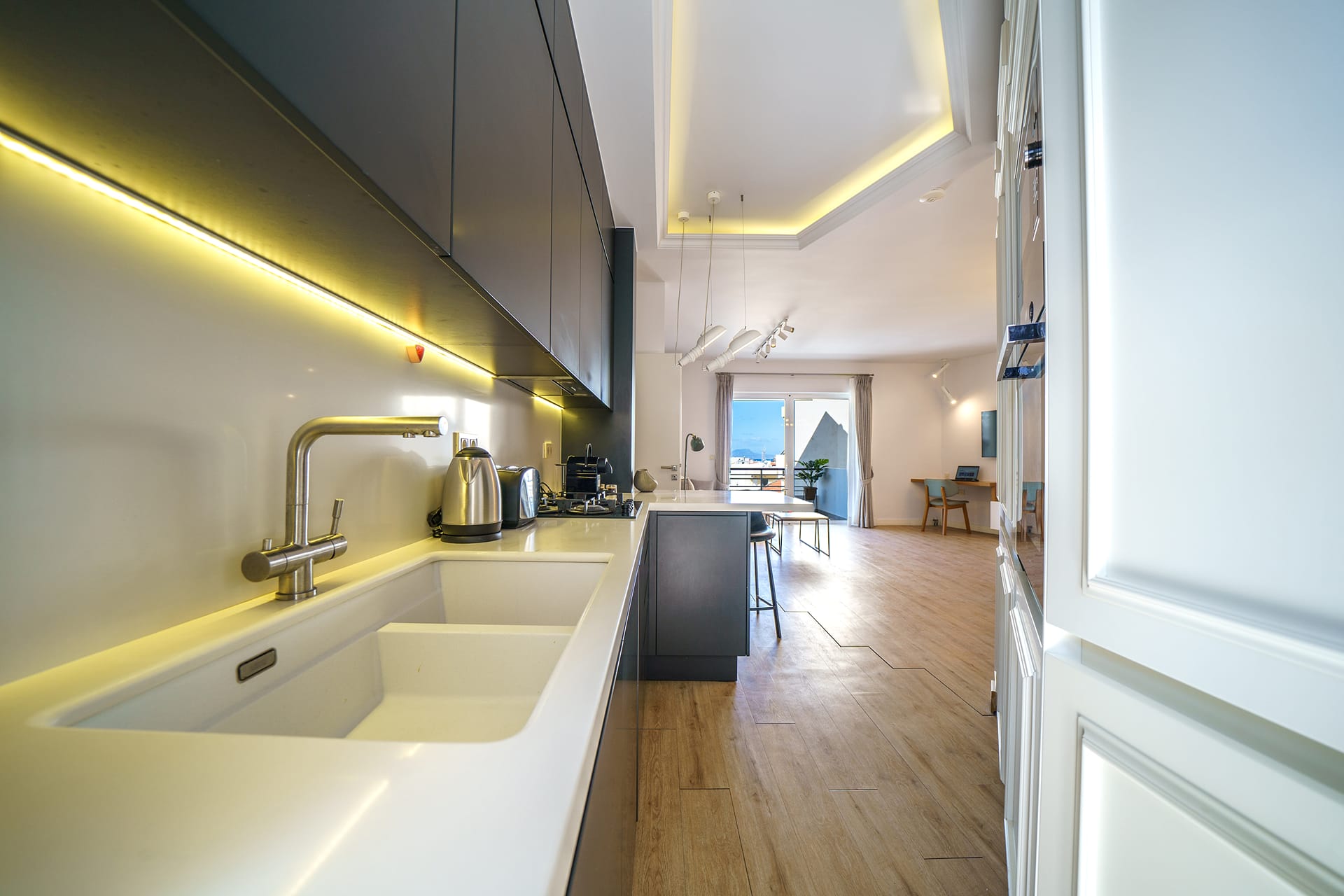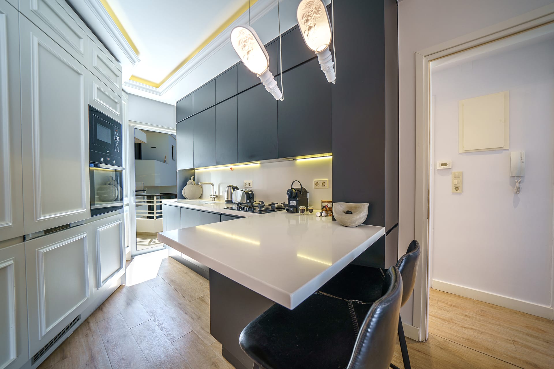 Enjoy a stylish experience at this modern, minimal apartment which is designed with calming white and grey tones, offering a relaxing and elegant atmosphere after a day of exploring.